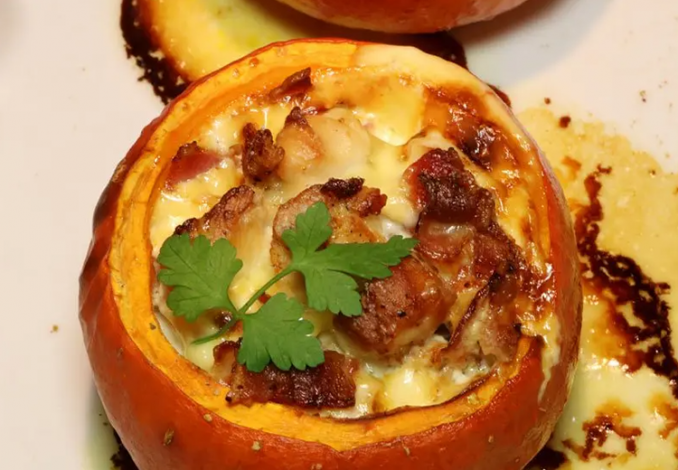 Servir le potimarron farci aux champignons et aux marrons bien chaud.