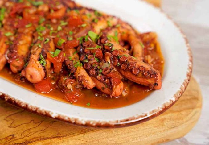Le poulpe en sauce est souvent servi avec du pain frais pour accompagner la sauce délicieuse. Cette préparation peut être adaptée en fonction des goûts personnels, en ajoutant d’autres herbes, des olives ou même un peu de vin blanc pour une touche supplémentaire de saveur.